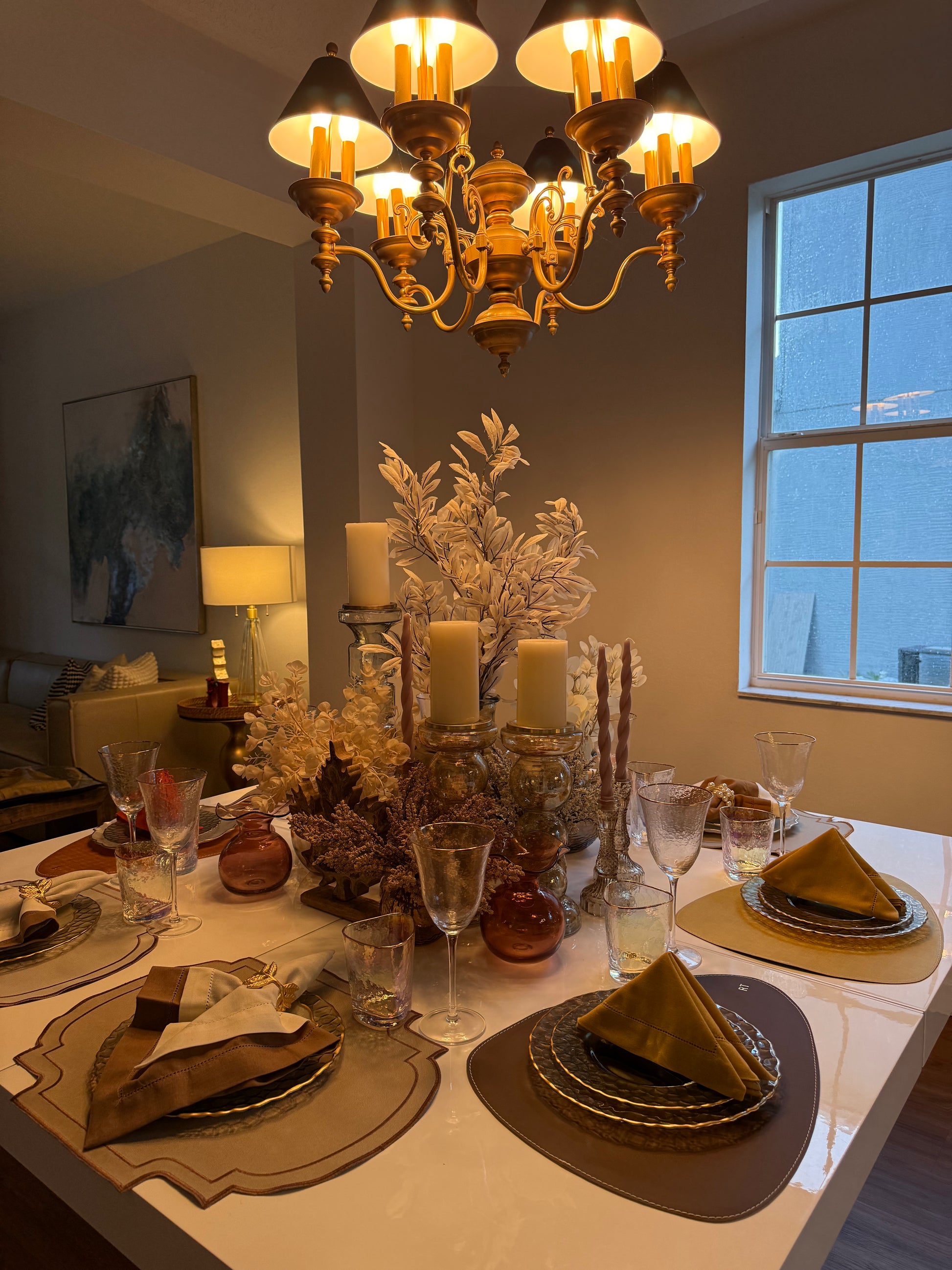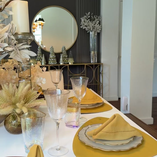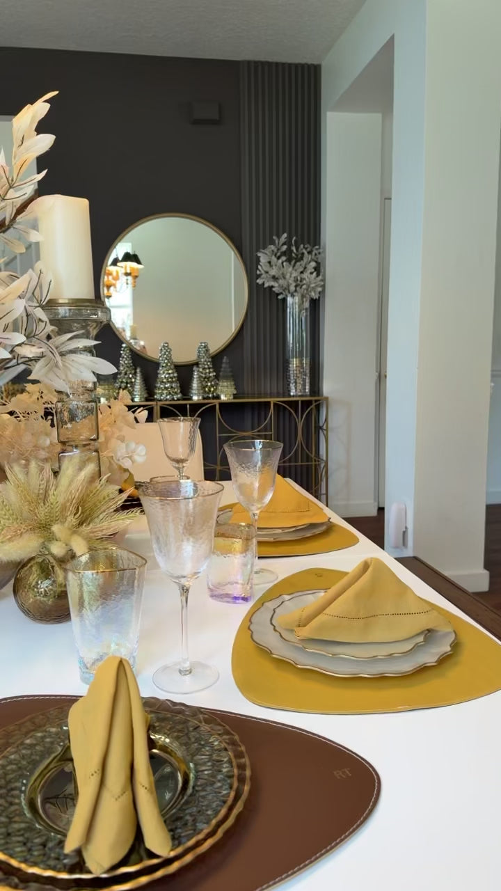 Double-sided leather placemats in mustard and brown.