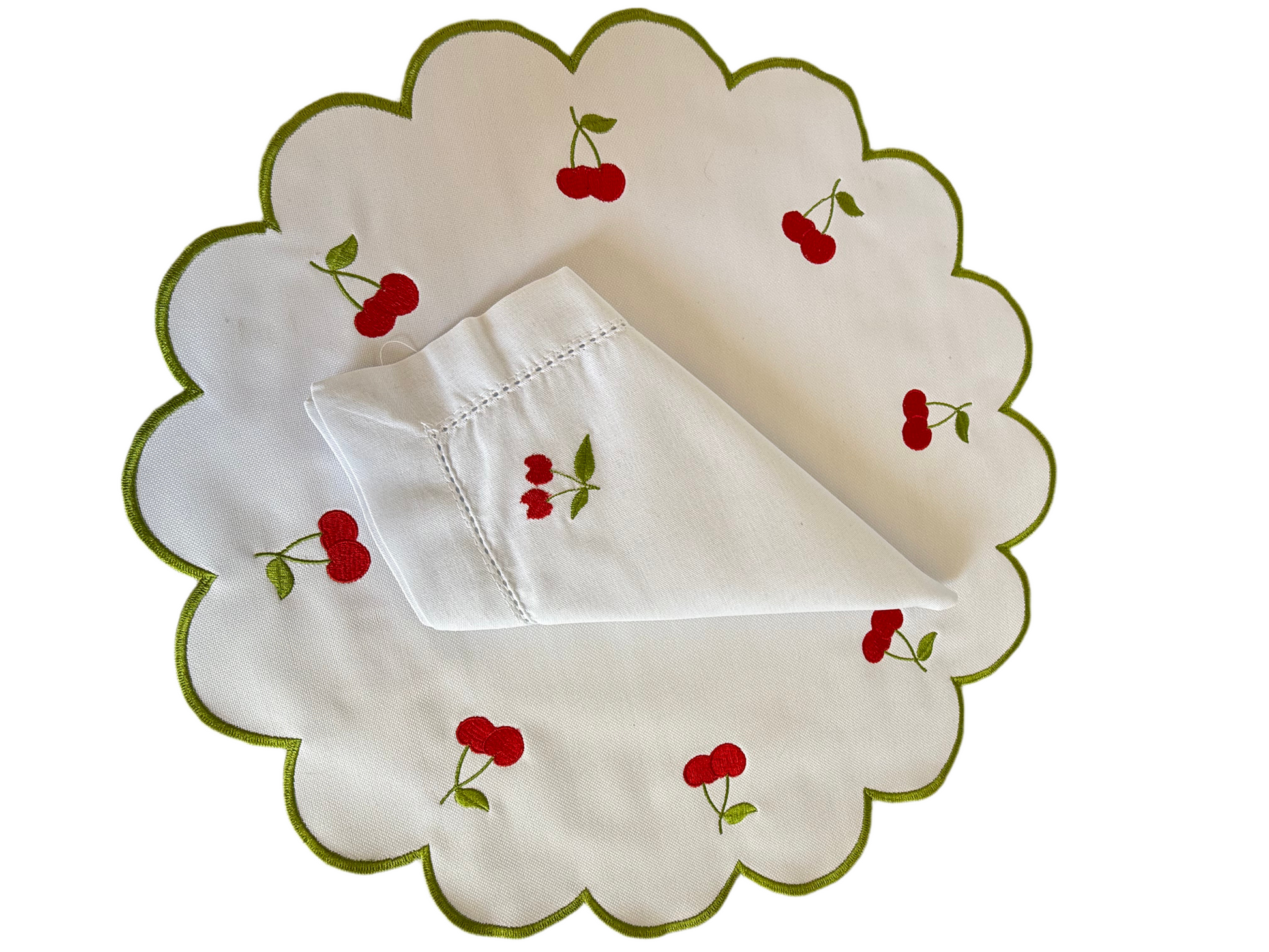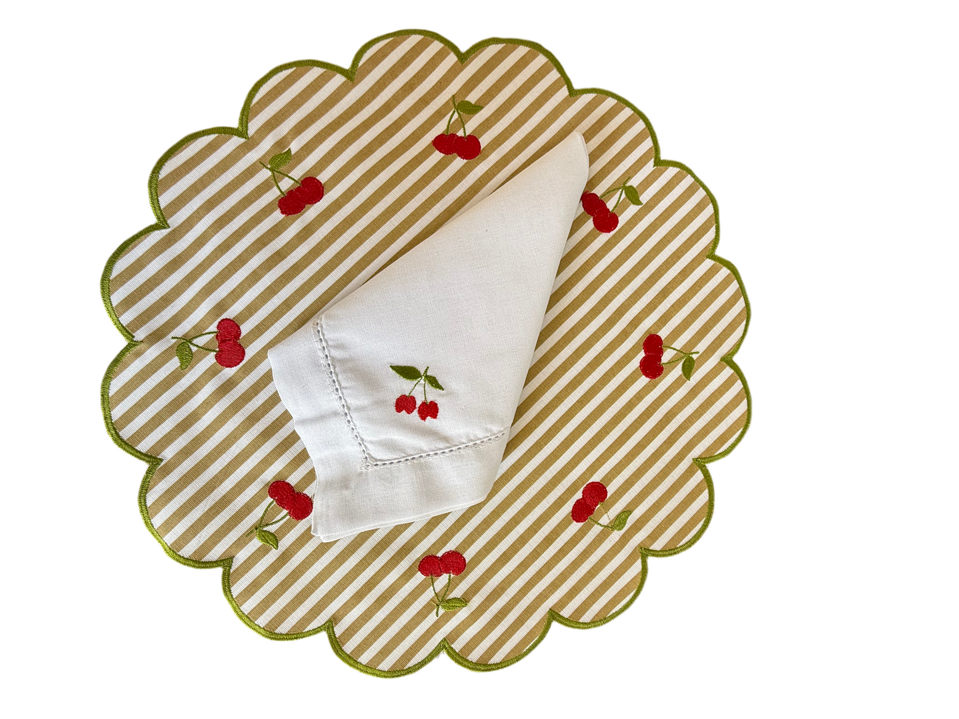 Placemats dupla face de cereja e listra bege com guardanapo .